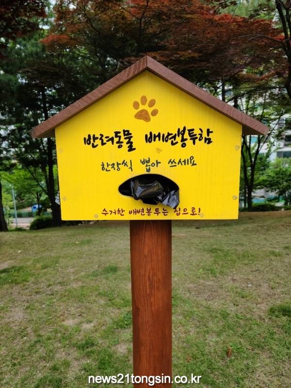 시흥시 나눔 목공소에서 제작한 우체통 모양의 배변봉투함에는 일회용 위생봉투을 비치했다. 배변봉투함에는 ‘한 장씩 사용할 것’, ‘사용한 배변봉투는 집으로 회수할 것’ 등 안내사항이 적혀있다.
