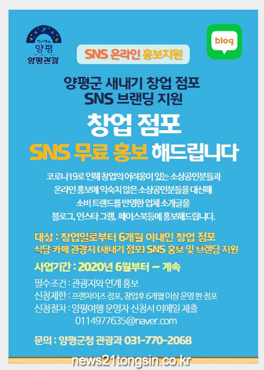 양평군이 온라인 홍보에 익숙지 않은 소상공인들을 대신해 창업을 한 점포를 대상으로 SNS홍보를 무료로 지원한다고 9일 밝혔다.