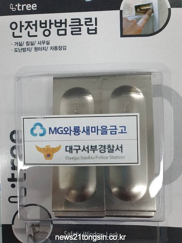 (대구=뉴스21통신) 유재원기자 = 대구서부경찰서 생활안전계와 와룡새마을금고(이사장 최태영)는 코로나19로 어려운 서민경제 속에서, 침입 범죄 노출 우려가 높은 1인 여성 가구를 위해 방범시설물인 ‘창문방범클립’ 제작ㆍ배포에 나섰다.