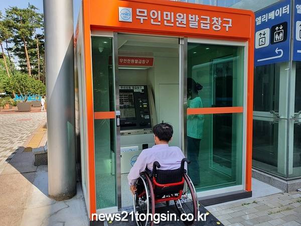 설치된 무인민원발급기는 시각 장애인을 위한 음성안내 시스템과 점자라벨, 이어폰 소켓 등 다양한 편의기능을 갖췄으며, 휠체어를 이용하는 주민도 쉽게 접근 가능한 경사로 출입구와 자동문 등을 완비했다.