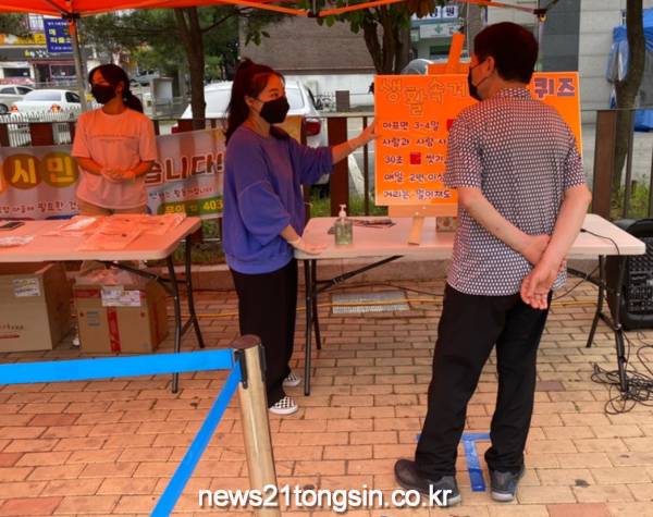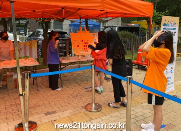 또한, 마스크착용과 더불어 서로간의 거리를 확보한 후 진행함으로써 캠페인 참여시 생활 속 거리두기를 실천할 수 있도록 하였고, 담당자의 경우 방역마스크와 멸균장갑을 전원 착용하였다.