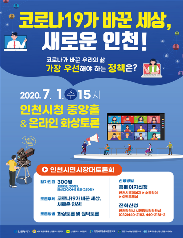 인천시(시장 박남춘)는 코로나19 확산 방지를 위해 오는 7월 1일, 기존 「인천 시민시장 대토론회」를 대규모 온라인 화상토론 방식으로 전환한다고 밝혔다.