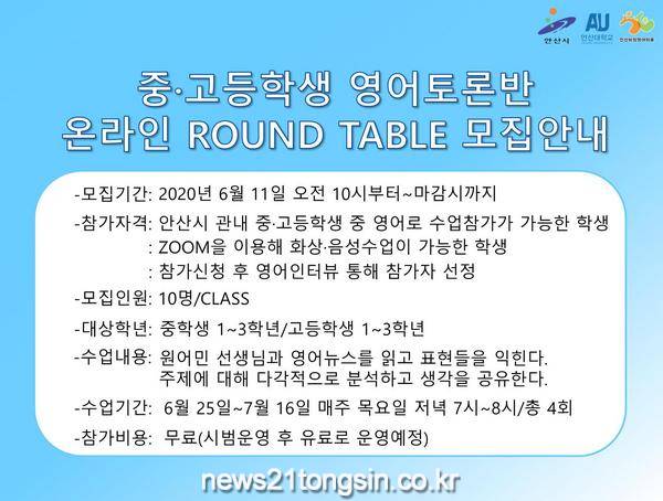 안산시(시장 윤화섭) 화정영어마을은 관내 중·고등학생의 영어학습을 위해 ‘영어토론반 온라인 ROUND TABLE’ 프로그램을 시작한다고 15일 밝혔다.