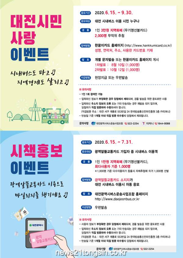 대전버스운송사업조합은 대전시민사랑 이벤트를 통해 6월 15일부터 9월 30일까지 시내버스를 이용하는 시민 중 2,000명을 추첨해 지역화폐(무기명 선불카드) 3만 원을 지급할 계획이다.