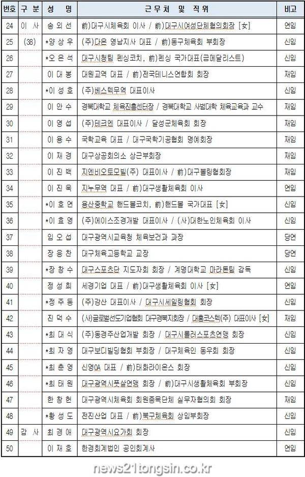 이사는 체육계, 유관기관, 학계, 지역 상공계, 여성계 등 38명의 각계의 인사들로 이뤄졌으며, 감사는 최경애 대구시요가회 회장, 이재호 한경회계법인 공인회계사 2명이 맡았다.