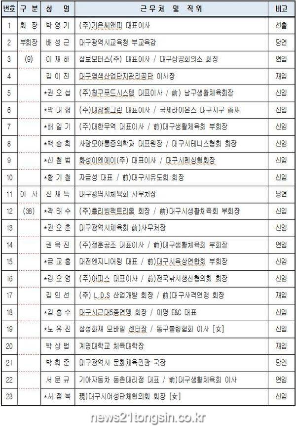 (대구=뉴스21통신) 유재원기자 = 대구시체육회는 초대 민선 체육회장 시대를 맞이하여 박영기 신임 회장을 시작으로 부회장 9명, 이사 38명, 감사 2명 등 총 50명으로 임원을 구성하고, 15일 대한체육회로 부터 인준을 받았다.