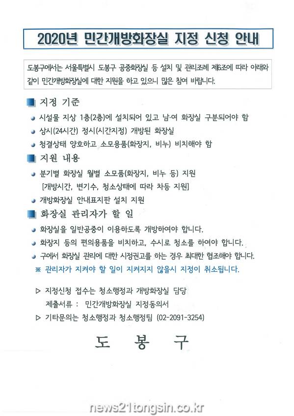 도봉구(구청장 이동진)는 구민들의 편의를 위해 민간개방화장실 지정사업 참여자를 상시 모집한다.