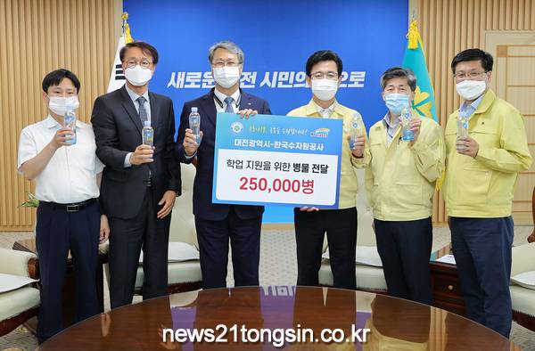 이날 전달식에서 한국수자원공사는 코로나19 극복을 위해 대전시에 약 25만병의 ‘케이워터(K-WATER) 병물’을 지원하기로 하고, 시는 코로나19 감염 우려로 교내 정수기 사용이 곤란한 학생들을 고려해 이를 각 학교에 공급하기로 했다.