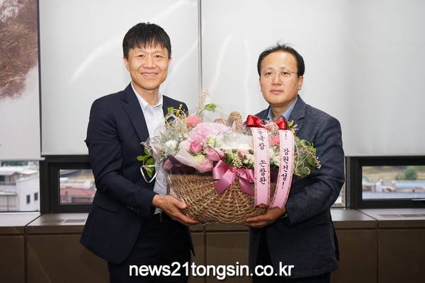 손창환 도 건설교통국장이 18일 코로나19 확산으로 어려움을 겪고 있는 지역 화훼농가를 돕기 위해 ‘플라워 버킷 챌린지’의 일환으로 심상배 한국토지주택공사(LH) 강원지역본부장에게 꽃바구니를 전달하고 있다.