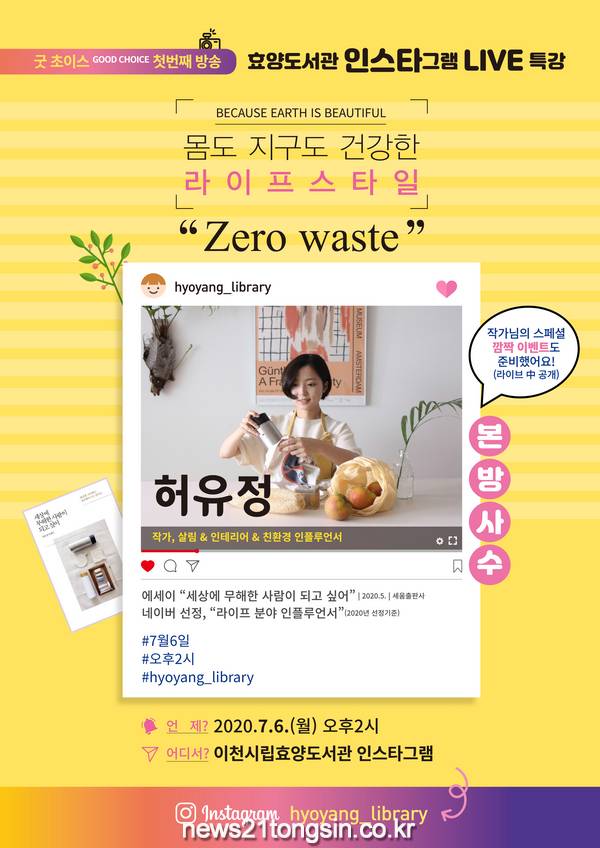 강의는 이천시립효양도서관 인스타그램(계정명: hyoyang_library) 라이브로 진행해 컴퓨터와 휴대폰 등을 통해 누구나 시청 가능하다. 작가와의 실시간 소통과 이벤트 등을 통해 친근하고 재미있게 진행될 예정이다.