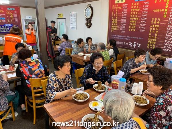 관내 타워빌아파트 경로당 회원 등 70세 이상 어르신 150여 명을 모시고, 짜장면과 과일, 음료수, 빵을 대접하는 자리를 마련했다.