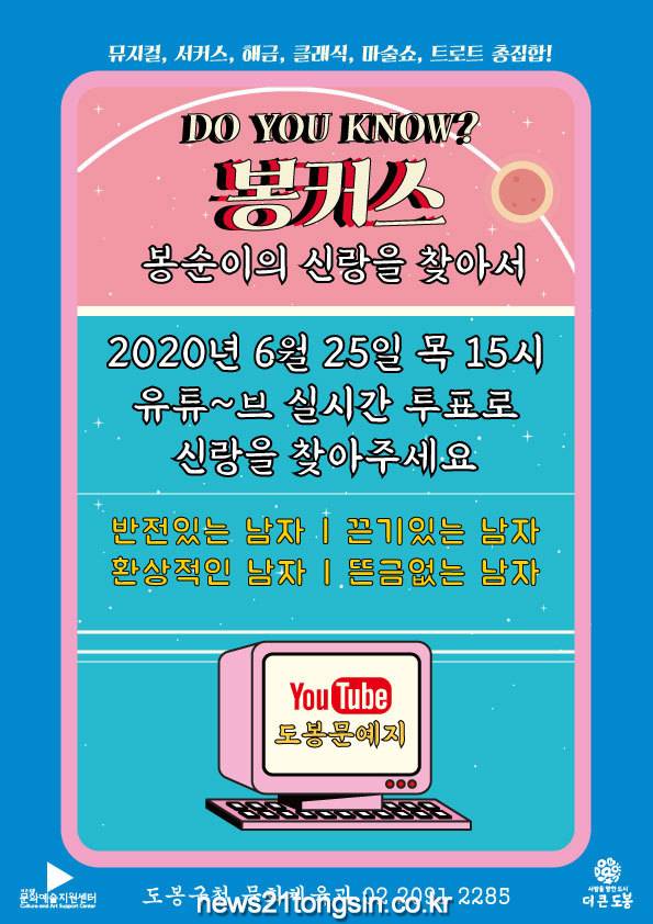 첫 공연인 ‘6월 지역예술인의 밤-봉순이의 신랑을 찾아서’는 6월 25일(목요일) 오후 3시에 도봉문예지 유튜브에서 실시간 스트리밍 된다. 도봉구청 홈페이지 내 상단에 위치한 ‘예술로(路) 희망을’ 팝업배너를 통해서도 감상할 수 있다.