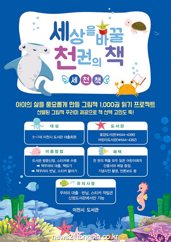 이천시(시장 엄태준) 이천시립어린이도서관은 6월 30일부터 5~7세 어린이 대상 독서 프로젝트 ‘세상을 바꿀 천 권의 책’(이하 세천책) 사업을 운영한다.
