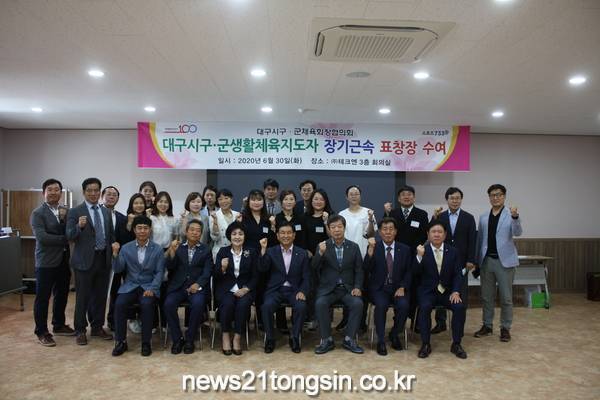 (대구=뉴스21통신) 유재원기자 = 대구광역시 구·군체육회는 30일(화) 오전 11시 (주)테크엔 3층 회의실에서 개최된 20년 장기근속 한 생활체육지도자 10명에게 표창 수여식을 가졌다.