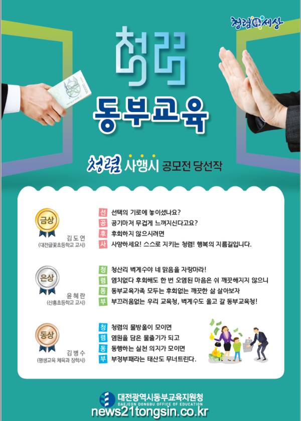 대전동부교육지원청(교육장 유덕희)은 청렴사행시 공모전 수상작을 활용한 홍보 포스터 2부와 청렴 스티커 1부를 각급 학교에 배부했다고 밝혔다.