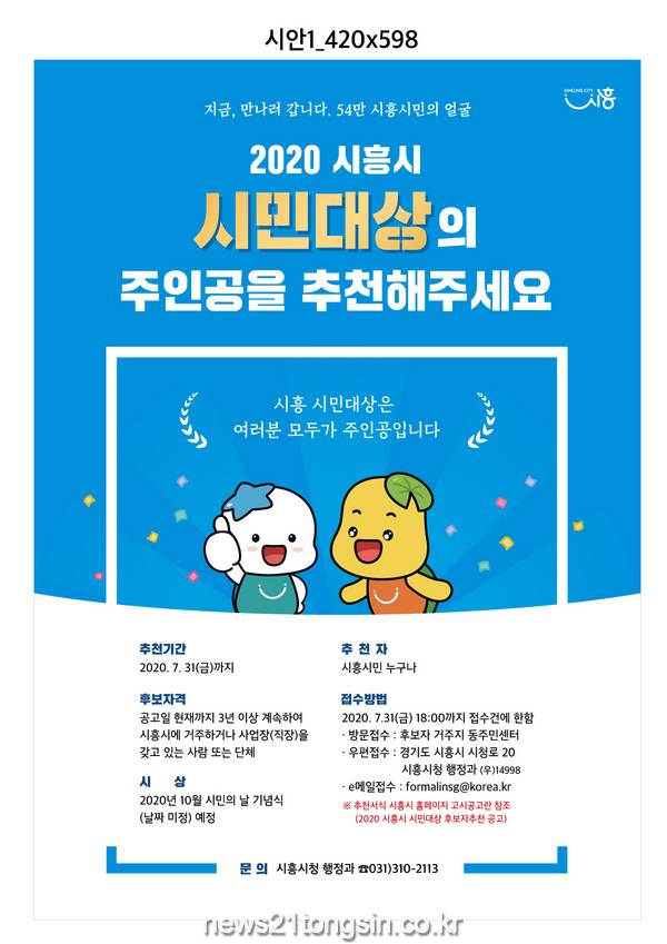 시흥시(시장 임병택)는 내달 7월 31일까지 2020 시흥시 시민대상 후보자를 시흥시민에게 추천받는다.