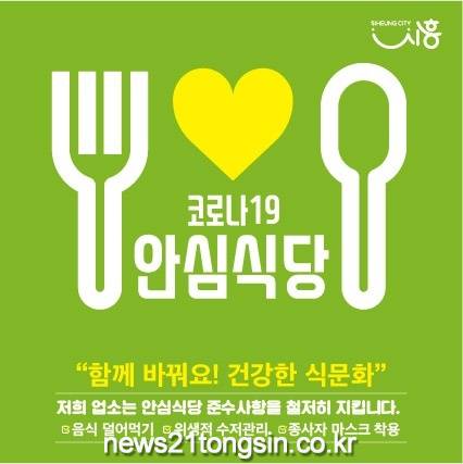 시흥시 코로나 19 안심식당 지정 조건은 △덜어먹기 가능한 도구를 제공할 것 △위생적인 수저관리 △종사자 마스크착용 △업소 소독 및 손 소독제 비치 △남은음식 재사용 안하기 실천을 필수로 한다.