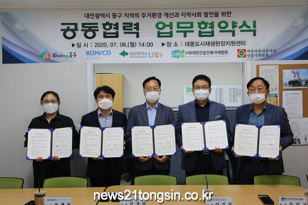 대전 동구(구청장 황인호)는 6일 대동 도시재생현장지원센터에서 대동 도시재생 사업지구 내 주거환경 개선과 에너지 나눔을 위한 동구청, 한국조폐공사, 대전대학교 LINK+사업단, (사)대전건설건축자재협회, 대동아름다운마을만들기위원회 5개 기관과 업무협약을 체결했다.