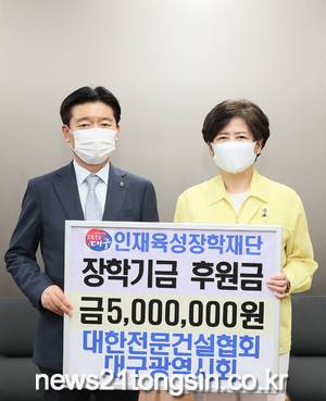 대구인재육성장학재단은 7월 6일(월) 오후 2시 대한전문건설협회 대구광역시회 제11대 회장단(김석 회장 외)이 대구시교육청을 방문해 장학금 5백만원을 기탁했다고 밝혔다.