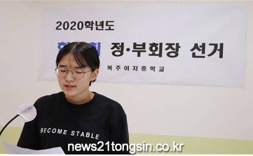 복주여자중학교(교장 이재일)는 7월 3일 (금) 7교시 2,3학년 출석 수업시 창의적 체험 활동시간과 7월 6일(월) 1교시 1학년 출석 수업시 창의적 체험 활동시간을 이용한 2020학년도 학생회 회장, 부회장 선거를 사상 최초로 유투브 실시간 생방송으로 진행하였다.