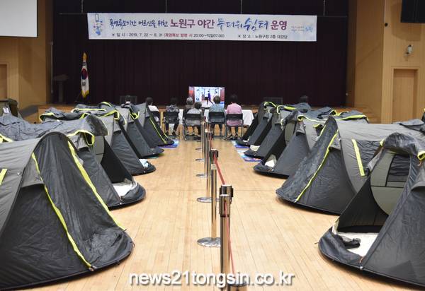 야간쉼터는 3곳으로 폭염특보 집중기간인 7월 말에서 8월 말까지 저녁 8시부터 다음날 아침 7시까지 운영한다. 구청 옆 노블레스 관광호텔 객실과 공릉동 서울과학기술대 기숙사 각각 50실을 통해 하루에 최대 150명이 이용할 수 있다. 객실은 1인 1실을 원칙으로 부부인 경우 함께 투숙한다. 이용료 구청이 부담한다. 월계 문화체육 센터에는 1인용 텐트 40개가 설치된다.
