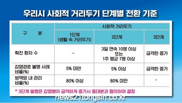 허태정 시장은 사회적 거리두기 단계의 상향 기준과 관련해 “확진 환자 수 기준, 3일 연속 10명 이상 발생하거나 주당 평균 1일 7명이상 발생할 경우, 감염경로가 불분명한 사례 발생 비율이 5% 이상일 경우, 방역망 내 관리 비율이 80%미만일 경우 등을 종합적으로 검토해 단계 조정을 결정할 것”이라고 기준을 밝혔다.