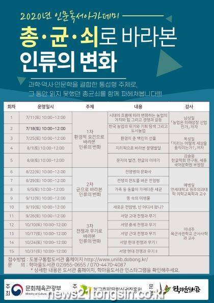 도봉문화재단 관계자는 “이번 강연은 코로나19로 인한 문화적 갈증을 느끼고 있을 우리 구민들에게 반가운 소식이며, 이번 인문독서아카데미 사업으로 인문학은 물론 독서문화 증진에도 많은 도움이 되었으면 좋겠다.”고 전했다.