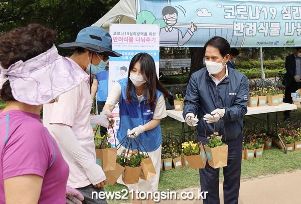 (대구=뉴스21통신) 유재원기자 = 대구시설공단은 코로나19 사태 장기화로 지친 시민들을 위해 7월 9일 신천둔치, 도심공원, 동대구역광장에서 ‘반려식물 나눠주기’행사를 개최하였다.