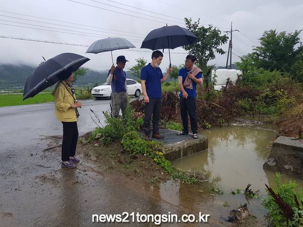 적중면장은 이날 적중면 저지대 침수위험지역 현장을 둘러보고 긴급응급복구를 지시했다.