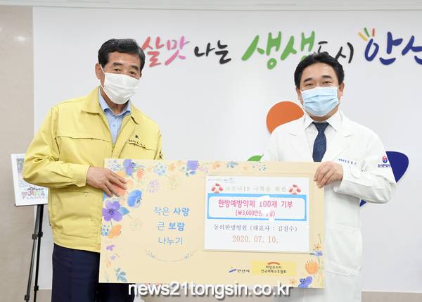 안산시(시장 윤화섭)는 동의한방병원으로부터 코로나바이러스감염증-19(코로나19) 확산 방지와 어르신들의 건강 증진을 위해 사용해 달라며 청폐배독탕 50재와 옥병풍산 50재 등 한방예방약제 100재(3천만 원 상당)를 기탁 받았다고 13일 밝혔다.