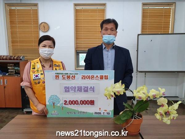 도봉구(구청장 이동진) 방학2동은 7월 10일 국제라이온스협회 354-C지구 퀸 도봉산 라이온스클럽(회장 박미애)과 지역사회 나눔문화 실천을 위한 업무협약을 체결하고 이웃돕기 성금 200만원 전달식을 가졌다.
