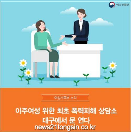 (대구=뉴스21통신) 유재원기자 = 폭력피해 이주여성에 대한 전문적인 상담 및 지원서비스를 제공하기 위한 ‘대구 폭력피해 이주여성상담소(이하 상담소)’가 국비 지원기관으로 선정돼 올해 9월 초 중구 향촌동(대구시 중구 서성로14길 112)에 개소할 예정이다.