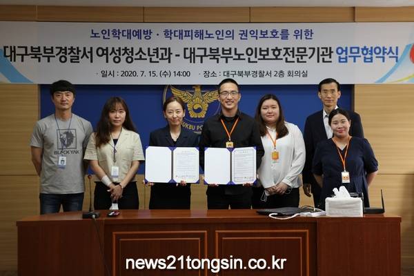 (대구=뉴스21통신) 유재원기자 = 대구북부경찰서는 2020. 7. 15.(수) 14:00, 2층 회의실에서 북부 노인보호전문기관과 노인학대 예방 및 학대피해노인 권익보호를 위한 업무협약을 체결하였다.