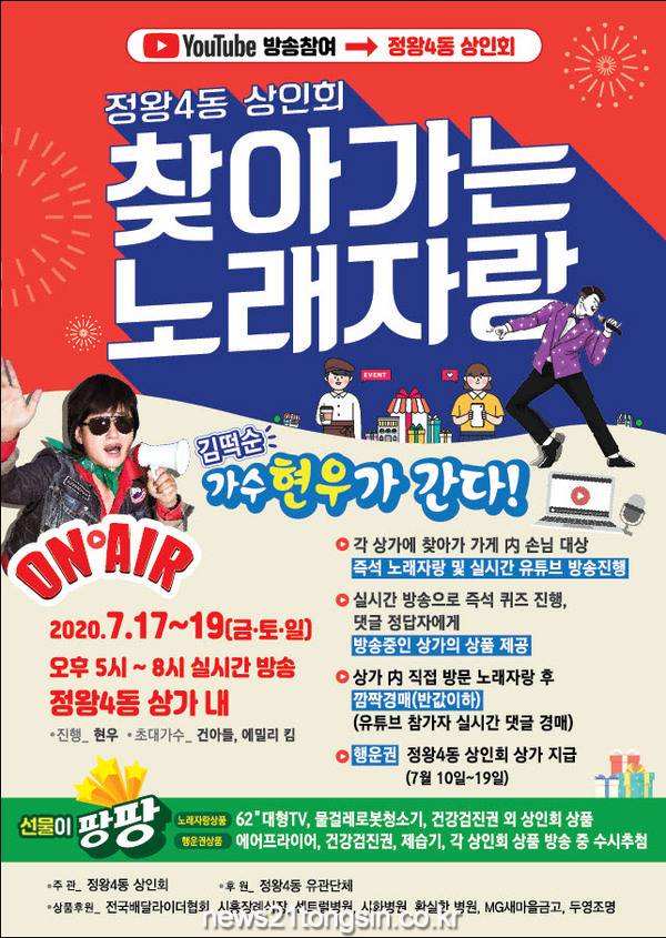 정왕4동(동장 서명범)은 오는 7월 17일부터 19일까지 3일간 ‘정왕4동 상인회 찾아가는 노래자랑’을 개최한다.