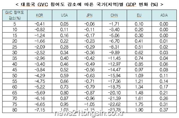 발제자료에서는 중국으로의 중간재 수출 감소를 대중국 GVC 약화의 대표적 사례로 가정하고 이에 따른 경제적 영향을 분석한 결과, 중국의 GDP가 가장 큰 폭으로 감소하고, 다음은 한국과 일본의 GDP 감소폭이 클 것으로 추정되는 반면 EU, 미국, 아시아 등 다른 지역의 GDP는 증가할 것으로 전망하였다. 이 위원은 “한국과 일본과 같이 대중국 의존도가 높은 나라는 수출기업이 내수산업으로 또는 타지역으로의 진출이 상대적으로 어려운 만큼 GVC 약화로 큰 타격을 입을 것”이라고 지적했다.