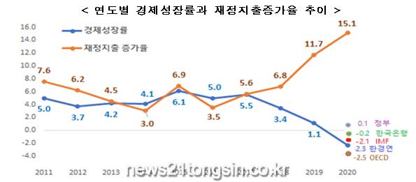 재정지출 증가율은 경제성장률보다 빠르게 증가하여 그 격차가 ’19년에 10.6배로 확대되었으며, 올해는 3차례 추경 편성으로 재정지출이 전년대비 15.1%나 증가하는데 반해 성장률은 마이너스를 기록할 가능성이 높다고 내다봤다.