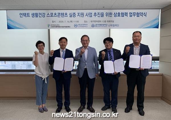 (대구=뉴스21통신) 유재원기자 = 16일 대구테크노파크(대구TP) 스포츠융복합산업지원센터는 대구벤처센터 12층 회의실에서 충남대학교 및 한국해양대학교 산학협력단과 ‘비대면(언택트) 생활건강 스포츠 콘텐츠 실증 추진’을 주요 내용으로 하는 다자간 업무협약(MOU)을 체결했다고 밝혔다.