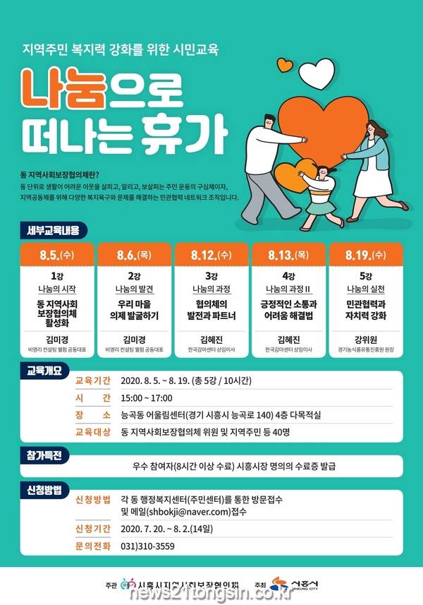 시흥시(시장 임병택)는 오는 8월 5일부터 8월 19일까지 총 5회에 걸쳐 주민 복지력 강화를 위한 시민교육 ⌜나눔으로 떠나는 휴가⌟를 능곡동 어울림센터 4층 다목적실에서 실시한다.