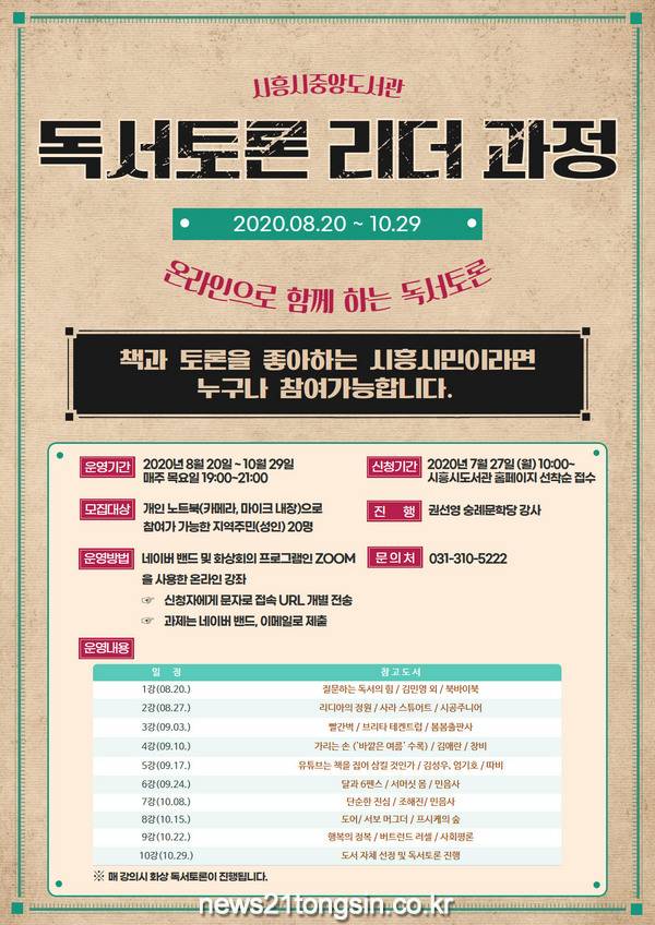 시흥시중앙도서관(관장 김경남)은 온라인 비대면 독서프로그램인 「독서토론 리더 과정」을 운영, 프로그램 참여자를 모집한다.