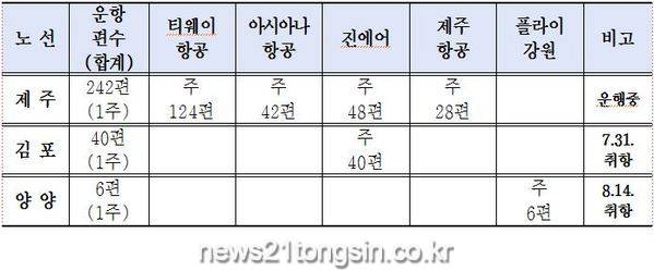 기존 제주노선 이외에 김포노선(7.31.취항)과 양양노선(8.14.취항)을 개설해 주 242편의 제주노선과 주 40편 김포노선 및 주 6편 양양노선을 확충으로 공항경쟁력을 높여 대구시민의 하늘길을 더욱 넓혔다.