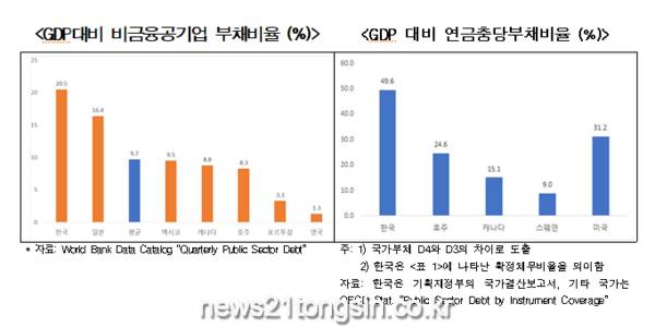 우리나라의 비금융공기업 부채는 GDP대비 20.5%로 비금융공기업 부채가 보고되는 OECD 7개국 중 가장 높고, 군인·공무원 연금의 충당부채도 49.6%로 OECD 국가 중 가장 높다.