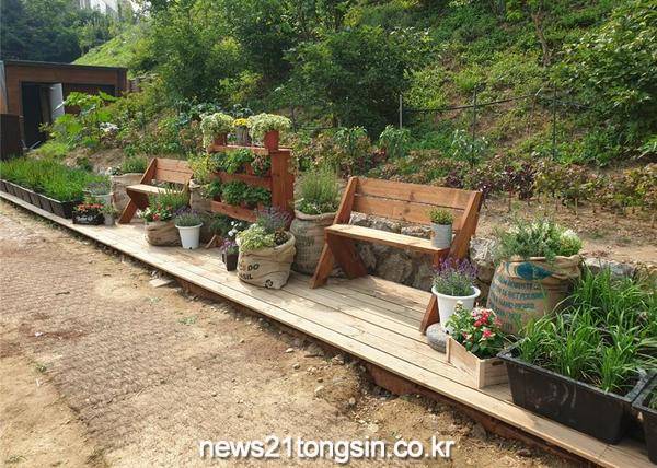 광진구(구청장 김선갑)가 광장동 자투리텃밭(광장동 582-3) 내 빈 공간에 다양한 화분과 소품, 벤치 등을 활용한 ‘텃밭 작은 전시장’을 조성했다.