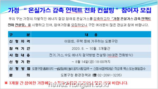 도봉구(구청장 이동진)는 가정의 자발적인 에너지 절약을 통해 온실가스를 줄이기 위한 ‘온실가스 감축 언택트 전화 컨설팅’ 사업을 진행한다.