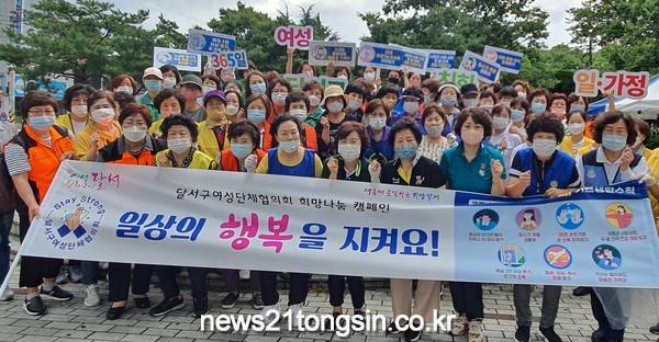 (대구=뉴스21통신) 박창남 기자 = 달서구는 달서구여성단체협의회(회장 김진숙)에서 7월 23일부터 25일까지 달서구청, 달서구여성단체협의회 회원 및 달서구여성친화도시모니터단원 등 100여명과 함께 상인네거리 외 2개소에서 ‘코로나19 극복 희망나눔 캠페인’을 했다고 밝혔다.