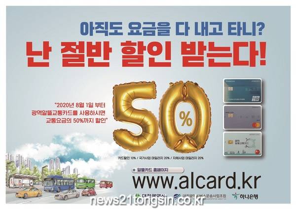 대전시는 8월 1일부터 광역알뜰교통카드 마일리지 추가 지원을 통해 대중교통요금의 최대 50%까지 할인해주는 사업을 시행한다고 28일 밝혔다.