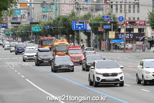 28일 오전 대전시는 서부소방서에서 서대전역네거리 4.0㎞ 구간에서 허태정 대전시장이 참석한 가운에 소방차량 3대가 정체된 교차로를 막힘없이 신속하게 통과하는 시연회를 가졌다.