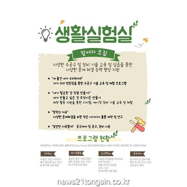 대전시 이성규 시민공동체국장은 “2020 생활실험실은 다양한 수공구와 기술교육, 체험 프로그램을 통해 내 물건은 내가 자가 수리할 수 있는 기술지원으로 다양한 사회 문제를 해결하는 데 많은 도움이 될 수 있도록 지원할 계획”이라고 밝혔다.