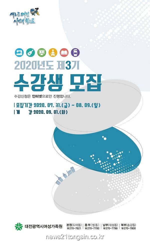 대전시 여성가족원은 오는 31일부터 8월 9일까지 2020년 제3기 강좌 수강생 6,799명을 모집한다고 29일 밝혔다.