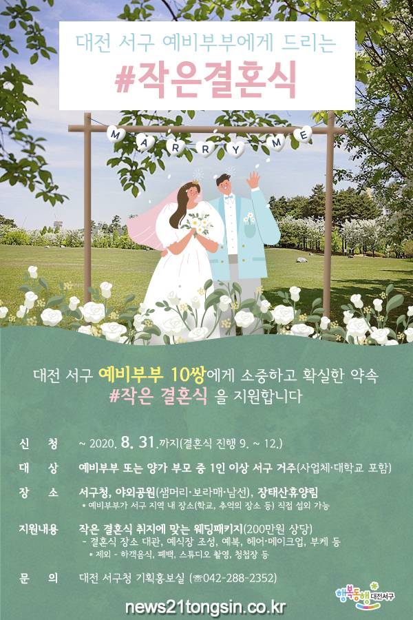 예비부부 또는 양가 부모 중 한 명이라도 서구에 거주하면 누구나 신청 가능하며, 서구청 홈페이지(www.seogu.go.kr/행정고시-공고)에서 신청양식을 작성해 이메일(nollamee@korea.kr) 또는 방문 접수하면 된다. 더욱 자세한 사항은 서구청 기획홍보실(☎042-288-2352)로 문의하면 된다.