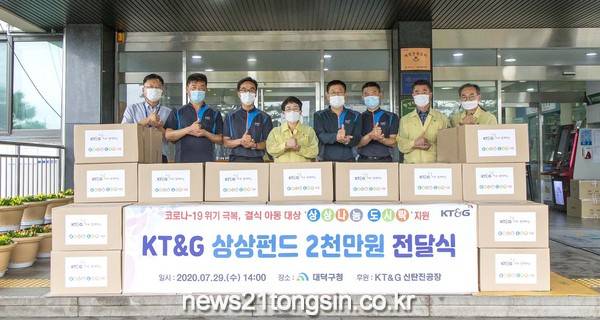 KT&G신탄진공장(공장장 김종철)은 29일 코로나19 장기화로 인해 어려움을 겪고 있을 결식우려아동을 위해 ‘상상나눔 도시락지원’사업비 2000만원을 대덕구(구청장 박정현)에 기탁했다.